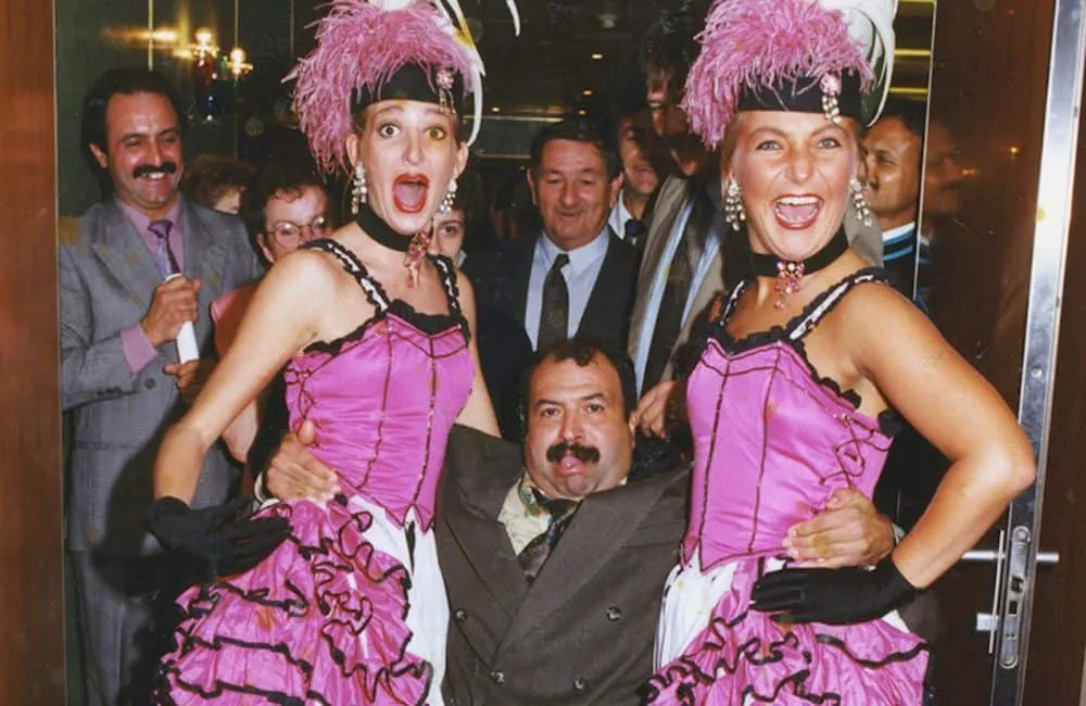 A man enjoying the festive atmosphere in a happy old cruise picture is flanked by two dancers wearing gaudy purple gowns and headdresses. This picture, which was taken in the colorful eighties or nineties, captures the carefree atmosphere of the time and provides a fun look into the past.