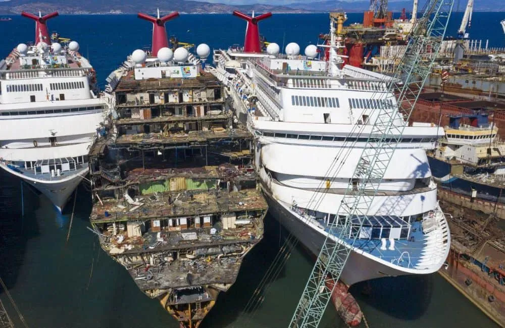 Eerie photo of a cruise ship graveyard, inspiring thoughts of a horror movie. When ships retire, they head to scrapyards like Alang in India or Aliaga in Turkey, fetching around $400 per ton for scrap metal. These graveyards hold once majestic vessels, now silent and still.