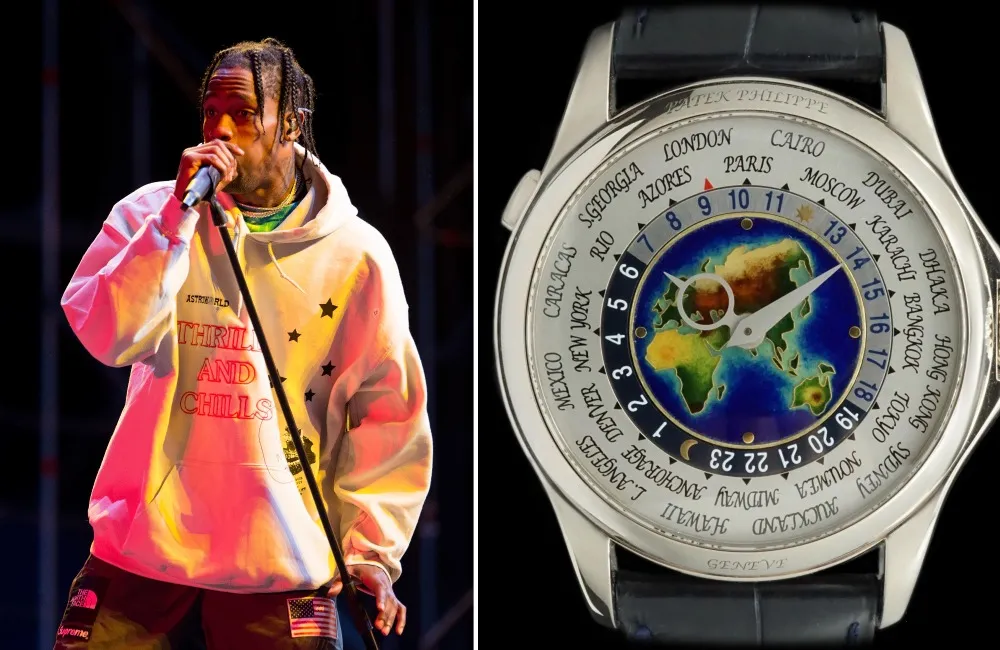 Travis Scott paid $125,000 for a rare Patek Philippe 5131G World Time watch. It shows the time in the world’s largest cities. The enamel dials on the watch are no longer manufactured, making it a status symbol. On his birthday, Travis showed it off, making collectors envious. According to The New York Times, it may take up to eight years to find one.