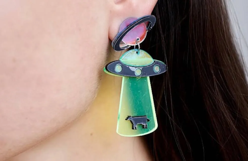 For $11.95, purchase the unique earrings @Froppin on Etsy. composed of acrylic, brass-zinc alloy, and plastic. shows a UFO hoisting a cow into a spacecraft. The cliché “Aliens want your cattle” is common in TV shows and films. It’s odd, but why are aliens concerned about livestock?